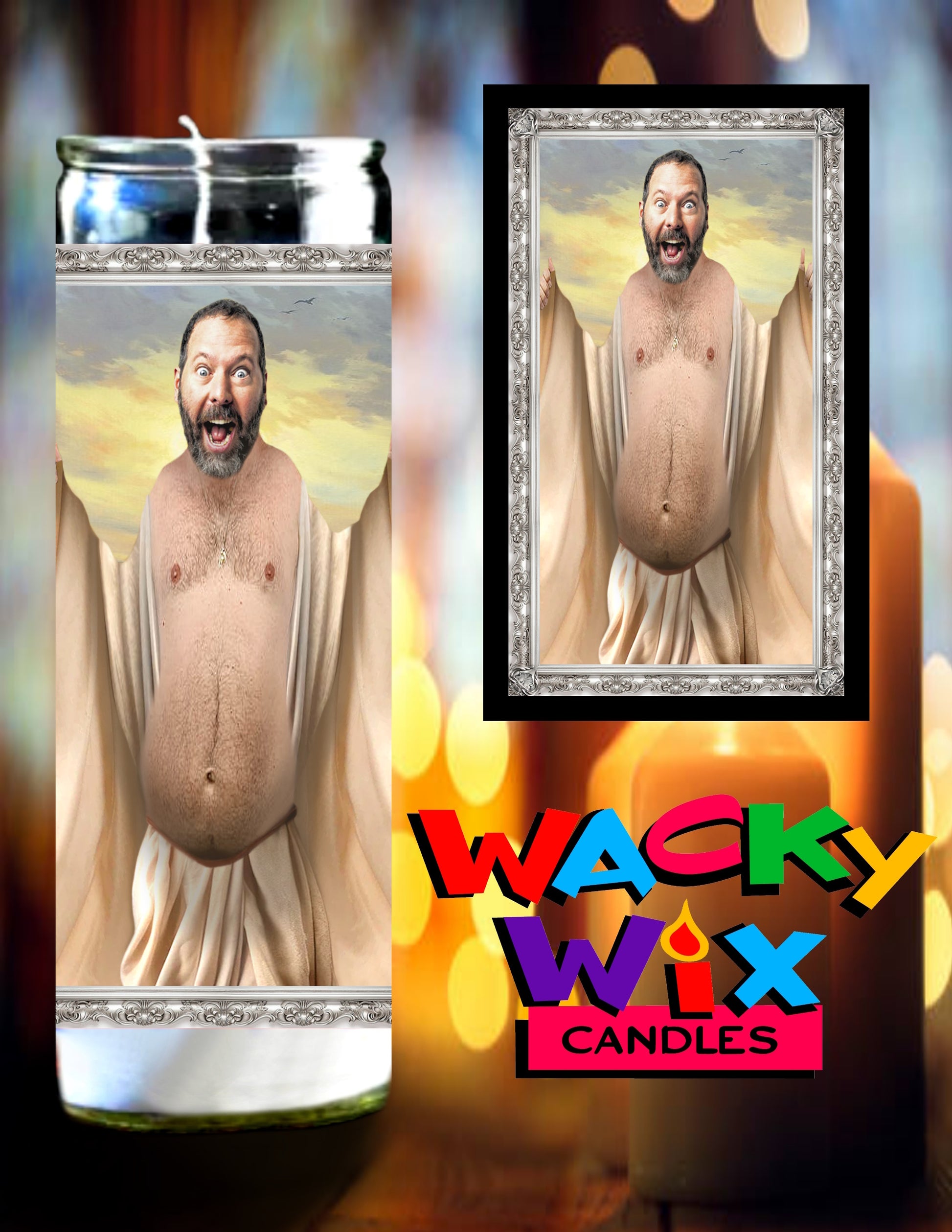 This prayer candle features Bert Kreischer famously known from his standup comedy. The unscented wax is enclosed in a 8 inch tall glass jar and designed to burn continuously up to 50 hours. The Bert Kreischer sticker is made of a removable matte finished vinyl. If you decide to burn the candle, the sticker can be easily peeled off and reapplied to another clean surface. Please wait for glass jar to cool before removing sticker.