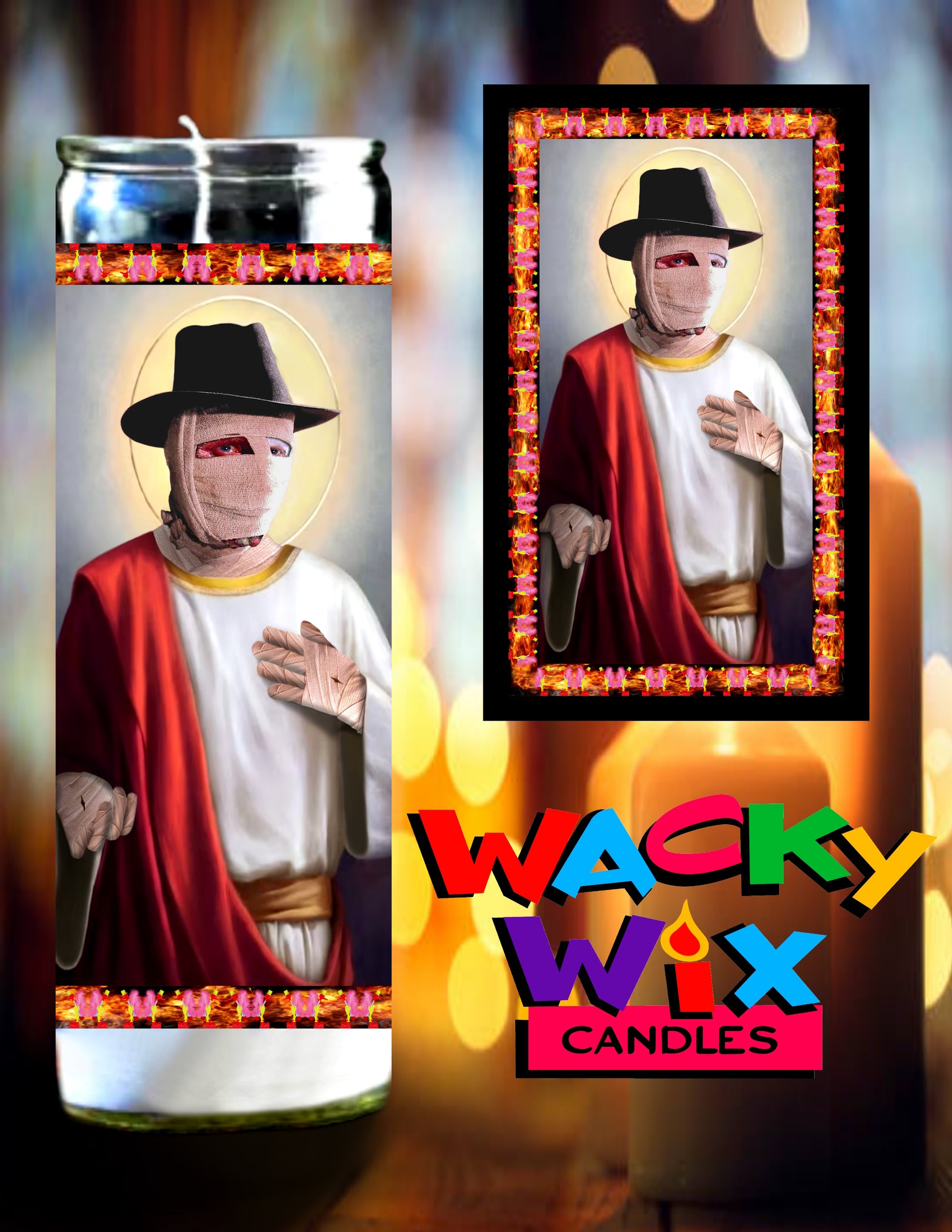 This prayer candle features Darkman famously known from the movie Darkman. The unscented wax is enclosed in a 8 inch tall glass jar and designed to burn continuously up to 50 hours. The Darkman sticker is made of a removable matte finished vinyl. If you decide to burn the candle, the sticker can be easily peeled off and reapplied to another clean surface. Please wait for glass jar to cool before removing sticker.