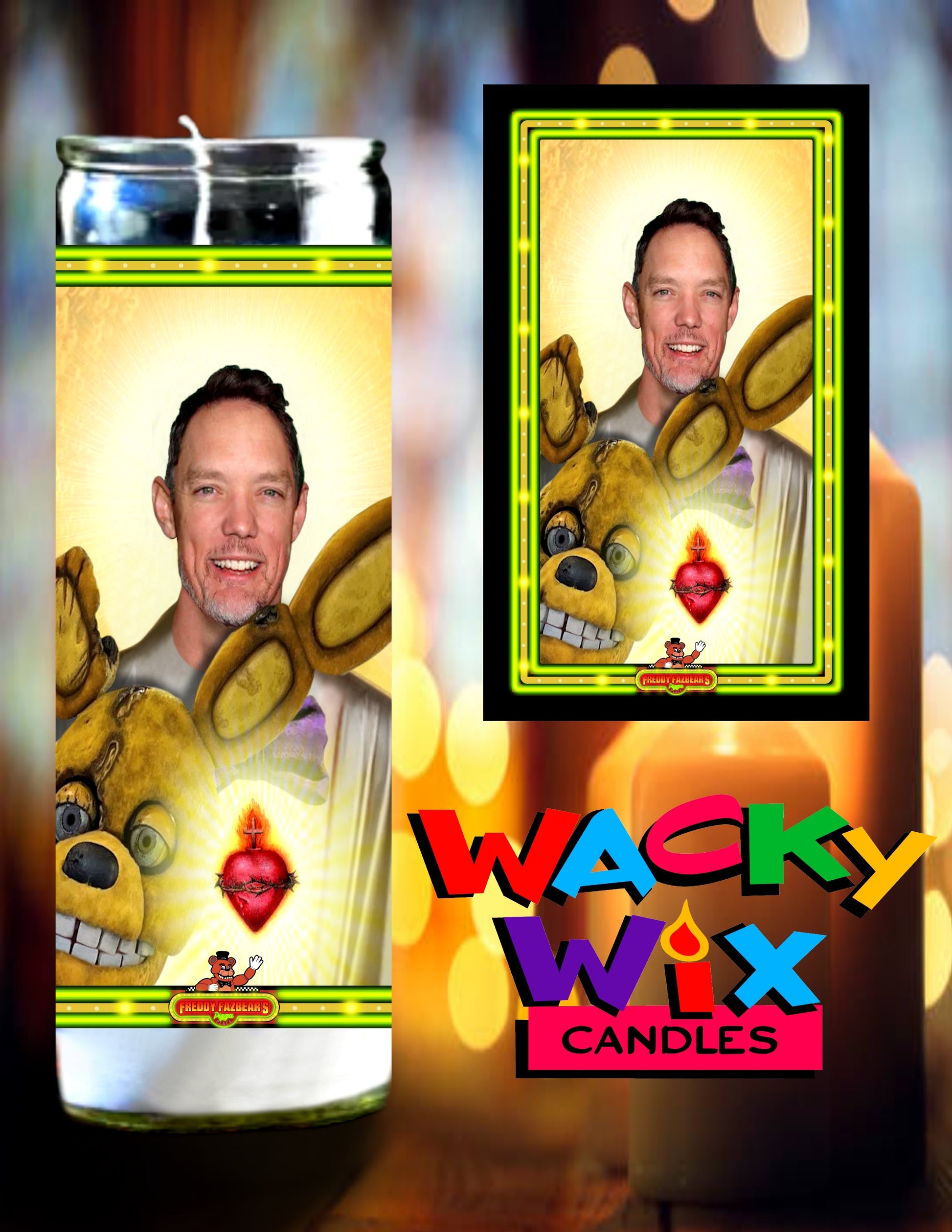 This prayer candle features Springtrap famously known from the movie Five Nights at Freddy's. The unscented wax is enclosed in a 8 inch tall glass jar and designed to burn continuously up to 50 hours. The Springtrap sticker is made of a removable matte finished vinyl. If you decide to burn the candle, the sticker can be easily peeled off and reapplied to another clean surface. Please wait for glass jar to cool before removing sticker.