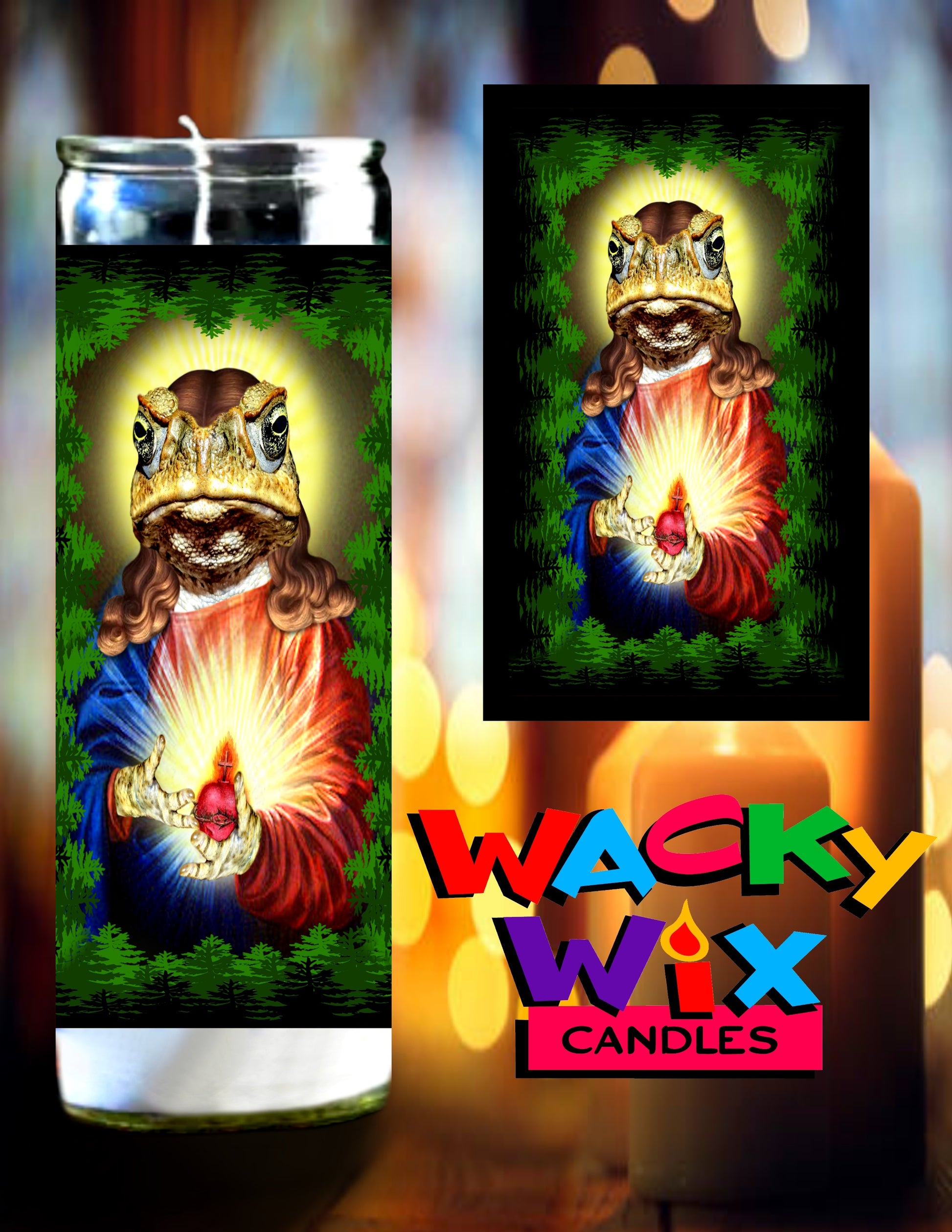 This prayer candle features Frogman famously known from the legendary stories. The unscented wax is enclosed in a 8 inch tall glass jar and designed to burn continuously up to 50 hours. The Frogman sticker is made of a removable matte finished vinyl. If you decide to burn the candle, the sticker can be easily peeled off and reapplied to another clean surface. Please wait for glass jar to cool before removing sticker.