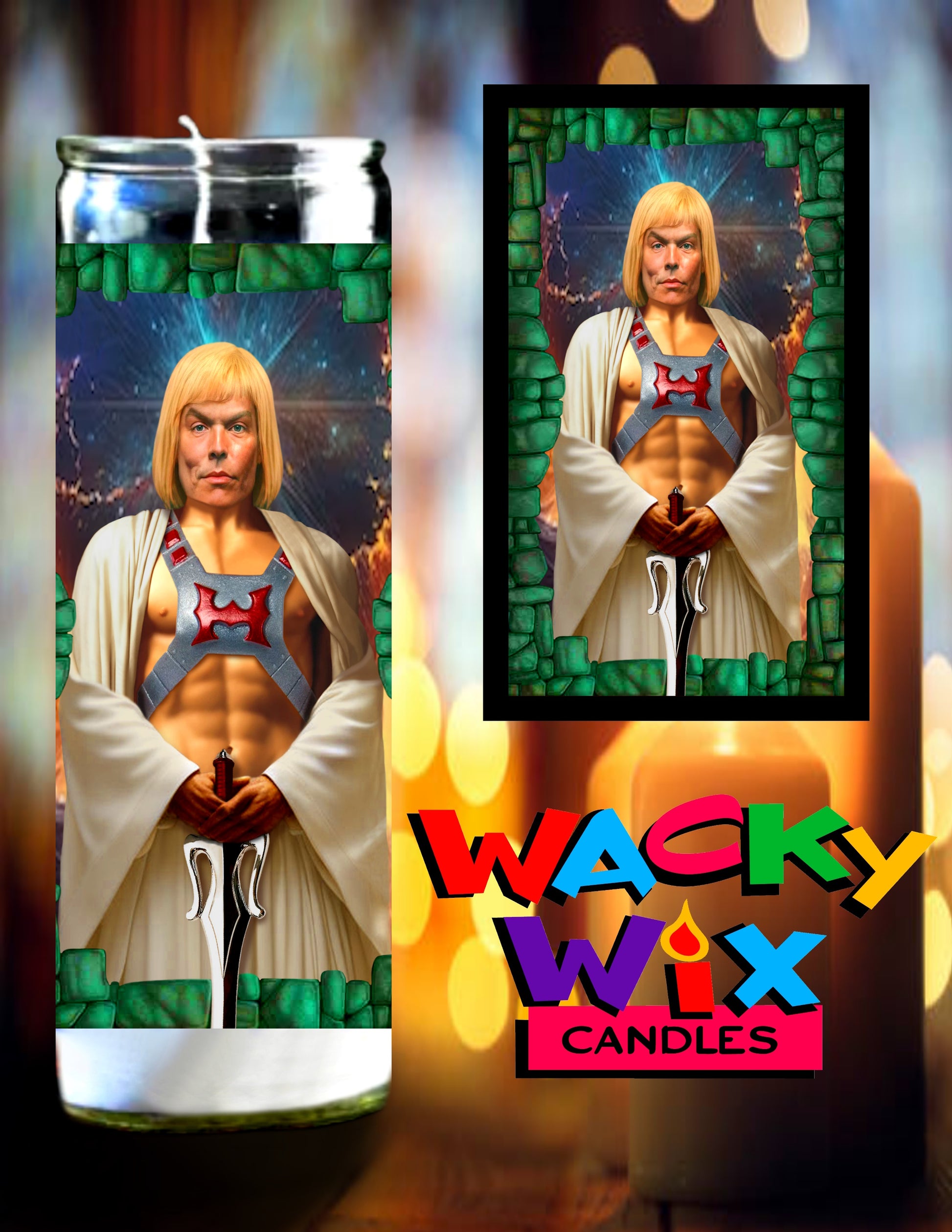 This prayer candle features He-Man famously known from the television show He=Man and the Masters of the Universe. The unscented wax is enclosed in a 8 inch tall glass jar and designed to burn continuously up to 50 hours. The Righteous Gemstones sticker is made of a removable matte finished vinyl. If you decide to burn the candle, the sticker can be easily peeled off and reapplied to another clean surface. Please wait for glass jar to cool before removing sticker.