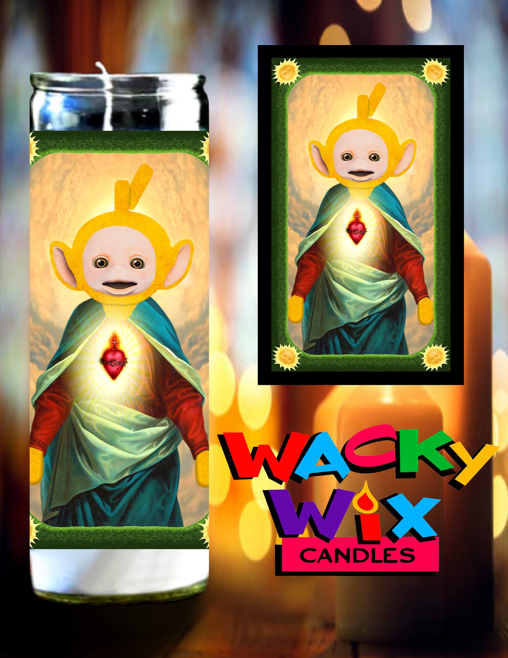 This prayer candle features Laa-Laa famously known from the television show Teletubbies. The unscented wax is enclosed in a 8 inch tall glass jar and designed to burn continuously up to 50 hours. The Laa-Laa sticker is made of a removable matte finished vinyl. If you decide to burn the candle, the sticker can be easily peeled off and reapplied to another clean surface. Please wait for glass jar to cool before removing sticker.