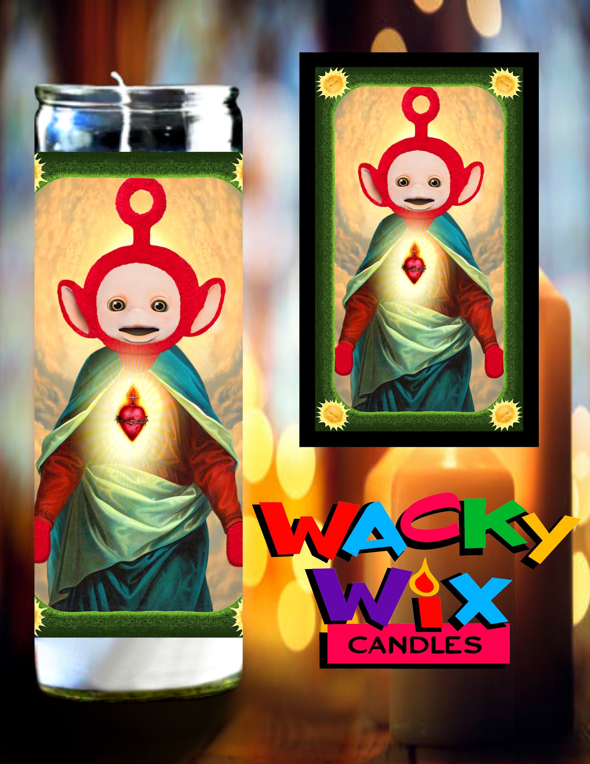 This prayer candle features Po famously known from the television show Teletubbies. The unscented wax is enclosed in a 8 inch tall glass jar and designed to burn continuously up to 50 hours. The Po sticker is made of a removable matte finished vinyl. If you decide to burn the candle, the sticker can be easily peeled off and reapplied to another clean surface. Please wait for glass jar to cool before removing sticker.