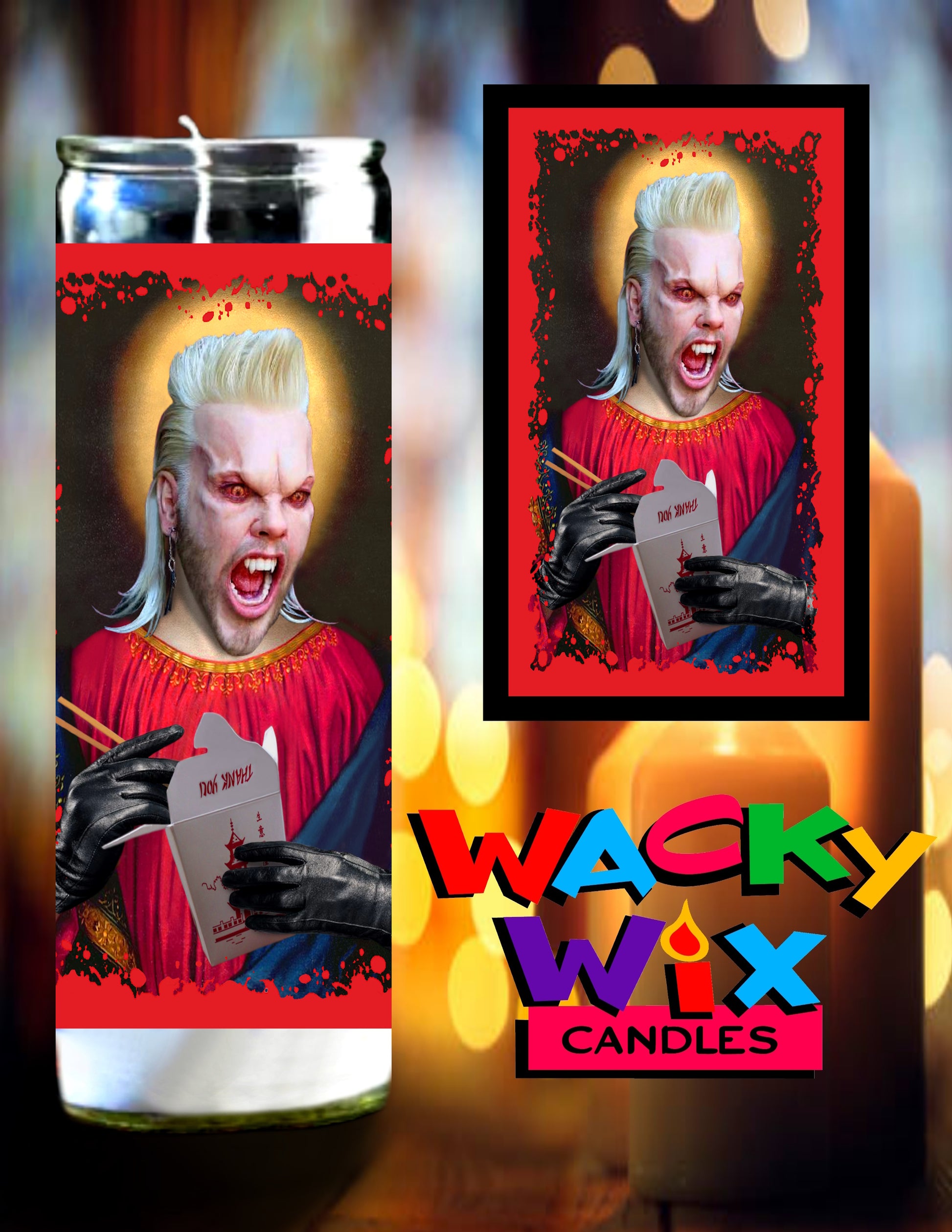 This prayer candle features David famously known from the movie The Lost Boys. The unscented wax is enclosed in a 8 inch tall glass jar and designed to burn continuously up to 50 hours. The David sticker is made of a removable matte finished vinyl. If you decide to burn the candle, the sticker can be easily peeled off and reapplied to another clean surface. Please wait for glass jar to cool before removing sticker.