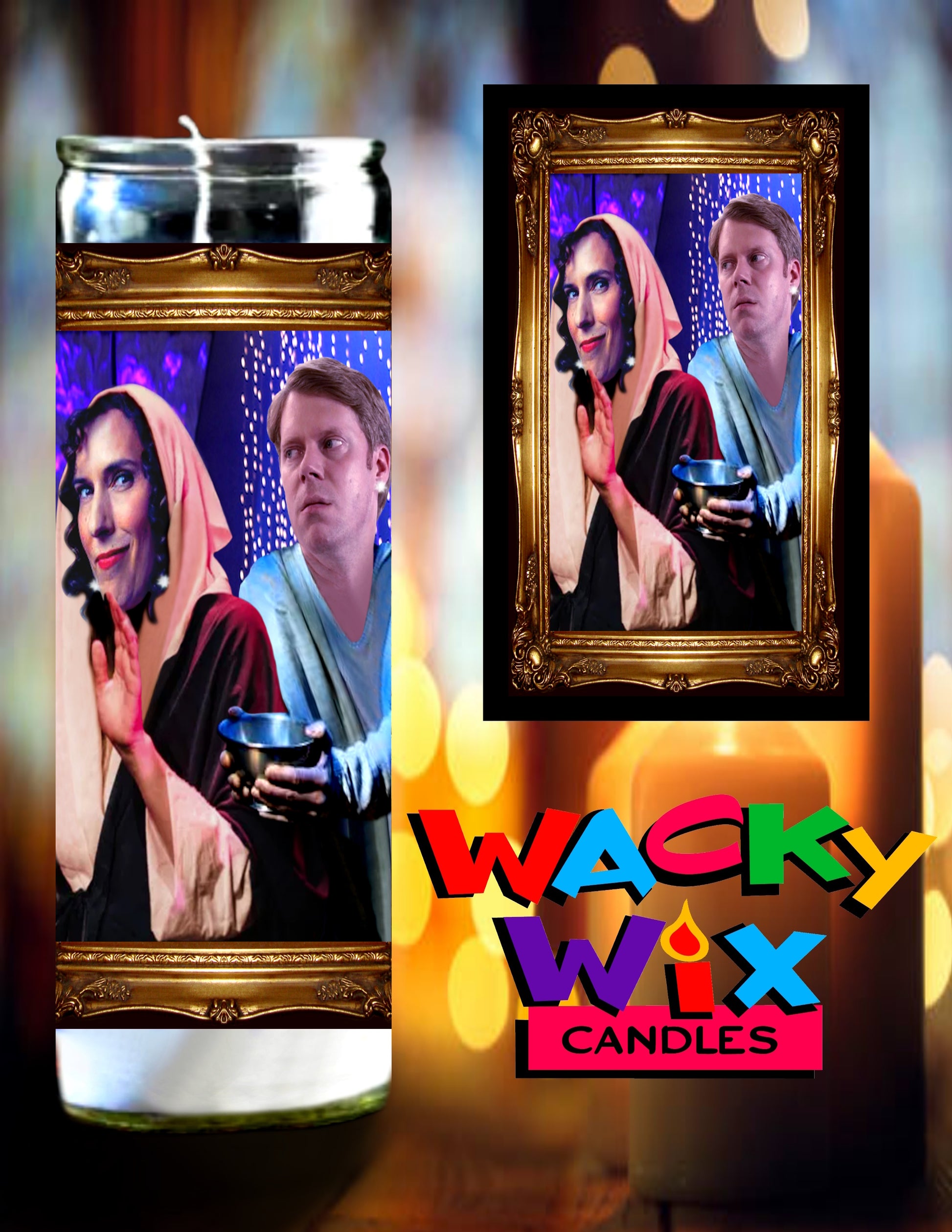 This prayer candle features Judy and BJ famously known from the television show The Righteous Gemstones. The unscented wax is enclosed in a 8 inch tall glass jar and designed to burn continuously up to 50 hours. The Righteous Gemstones sticker is made of a removable matte finished vinyl. If you decide to burn the candle, the sticker can be easily peeled off and reapplied to another clean surface. Please wait for glass jar to cool before removing sticker.