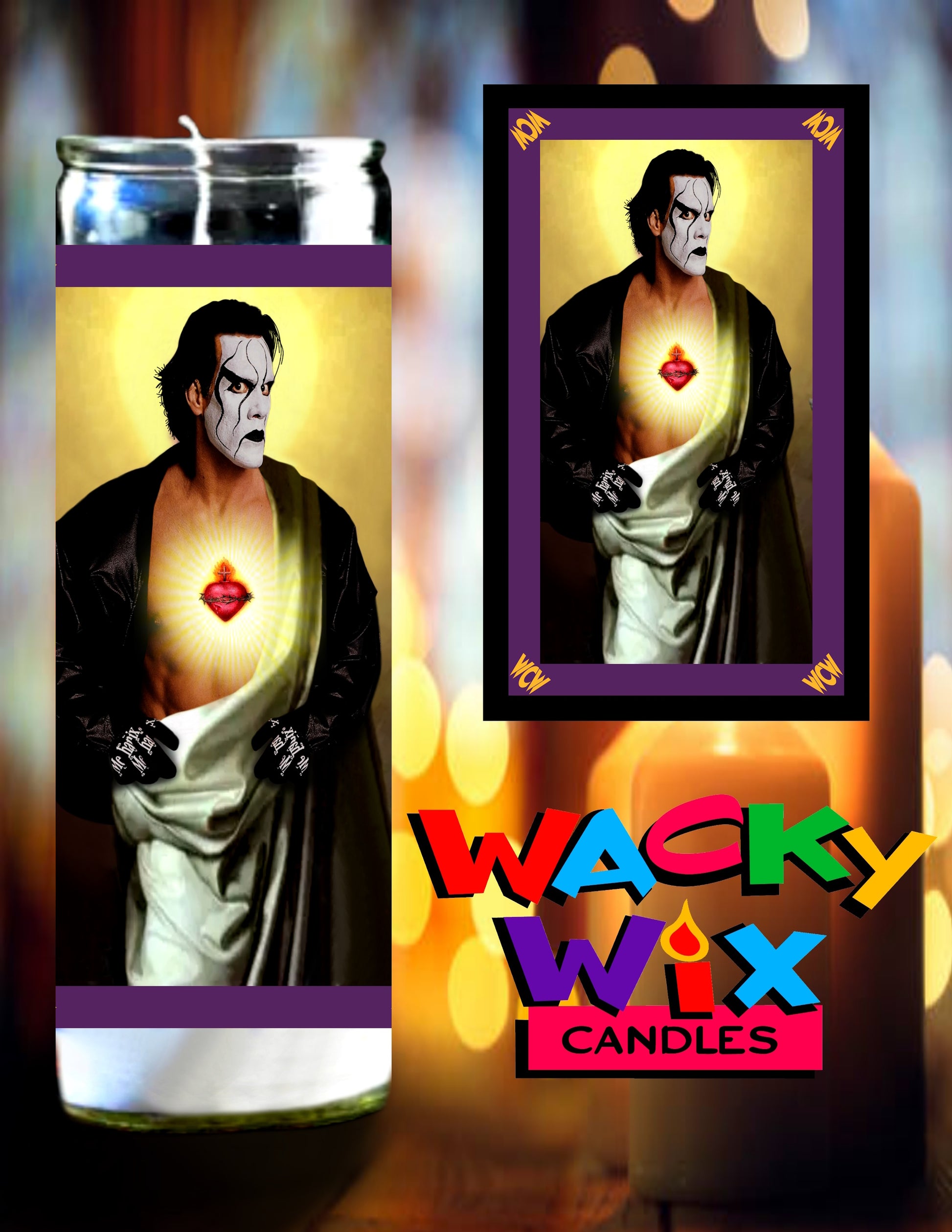 This prayer candle features Sting famously known from the WCW. The unscented wax is enclosed in a 8 inch tall glass jar and designed to burn continuously up to 50 hours. The Sting sticker is made of a removable matte finished vinyl. If you decide to burn the candle, the sticker can be easily peeled off and reapplied to another clean surface. Please wait for glass jar to cool before removing sticker.