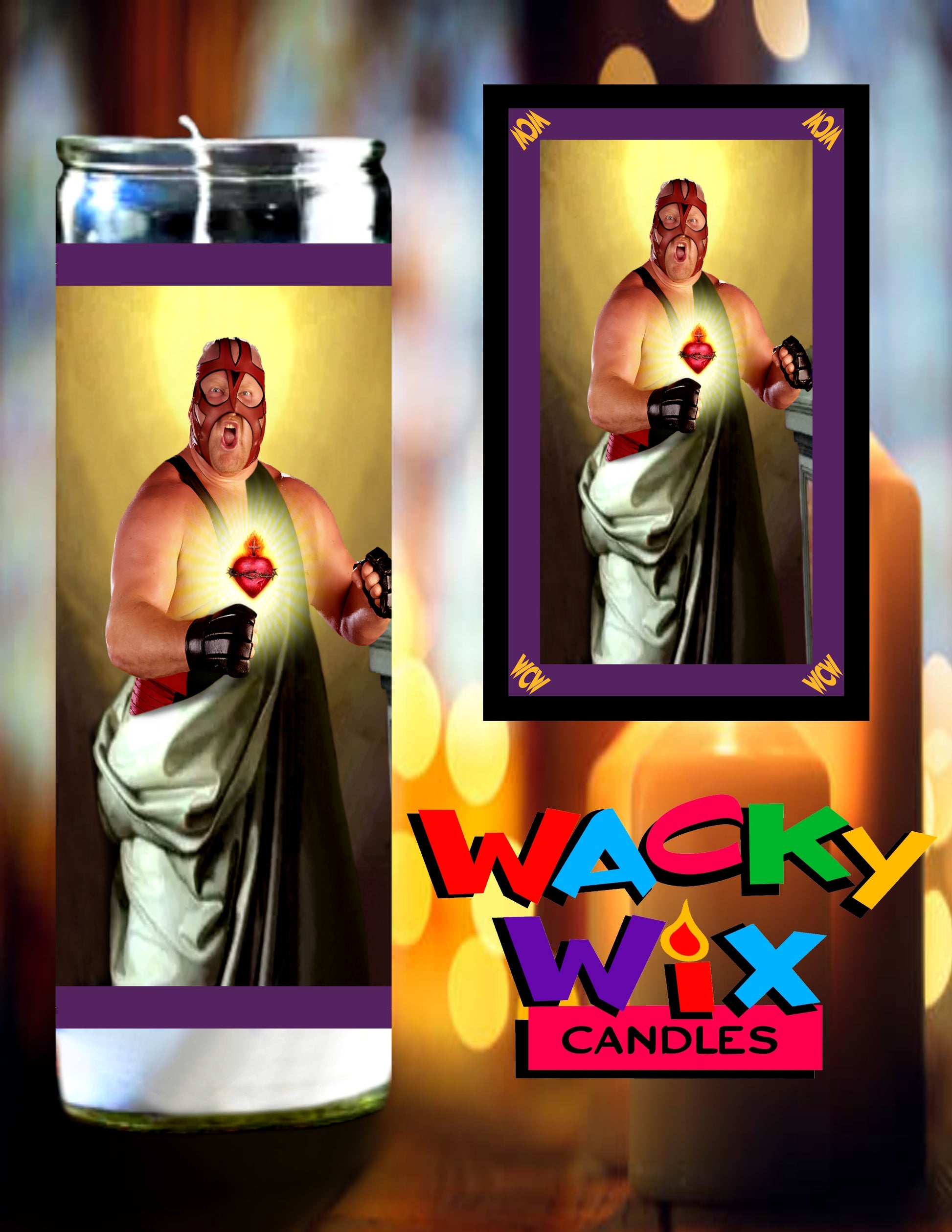 This prayer candle features Vader famously known from the WCW. The unscented wax is enclosed in a 8 inch tall glass jar and designed to burn continuously up to 50 hours. The Vader sticker is made of a removable matte finished vinyl. If you decide to burn the candle, the sticker can be easily peeled off and reapplied to another clean surface. Please wait for glass jar to cool before removing sticker.