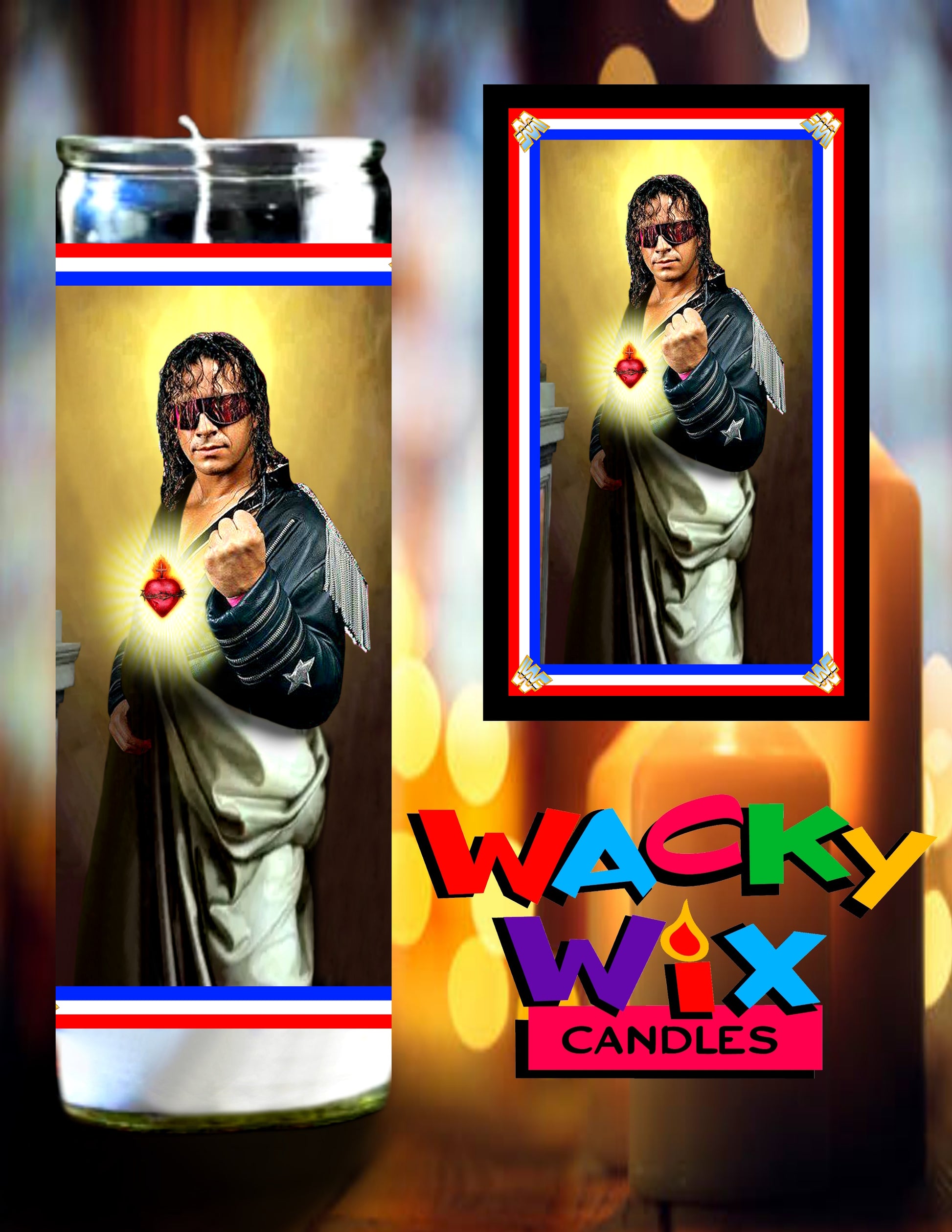 This prayer candle features Bret Hart famously known from the WWF. The unscented wax is enclosed in a 8 inch tall glass jar and designed to burn continuously up to 50 hours. The Bret Hart sticker is made of a removable matte finished vinyl. If you decide to burn the candle, the sticker can be easily peeled off and reapplied to another clean surface. Please wait for glass jar to cool before removing sticker.