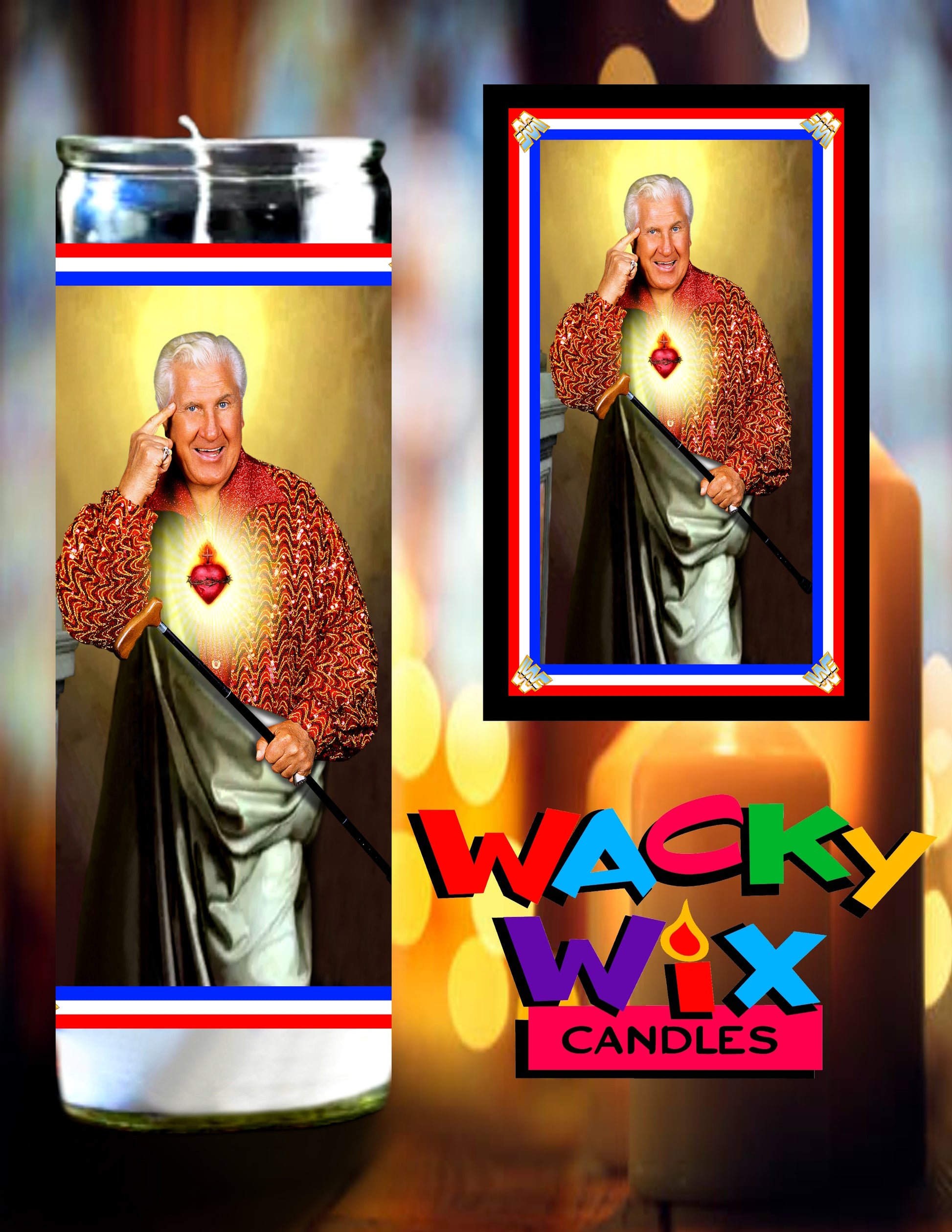 This prayer candle features Freddie Blassie famously known from the WWF. The unscented wax is enclosed in a 8 inch tall glass jar and designed to burn continuously up to 50 hours. The Freddie Blassie sticker is made of a removable matte finished vinyl. If you decide to burn the candle, the sticker can be easily peeled off and reapplied to another clean surface. Please wait for glass jar to cool before removing sticker.