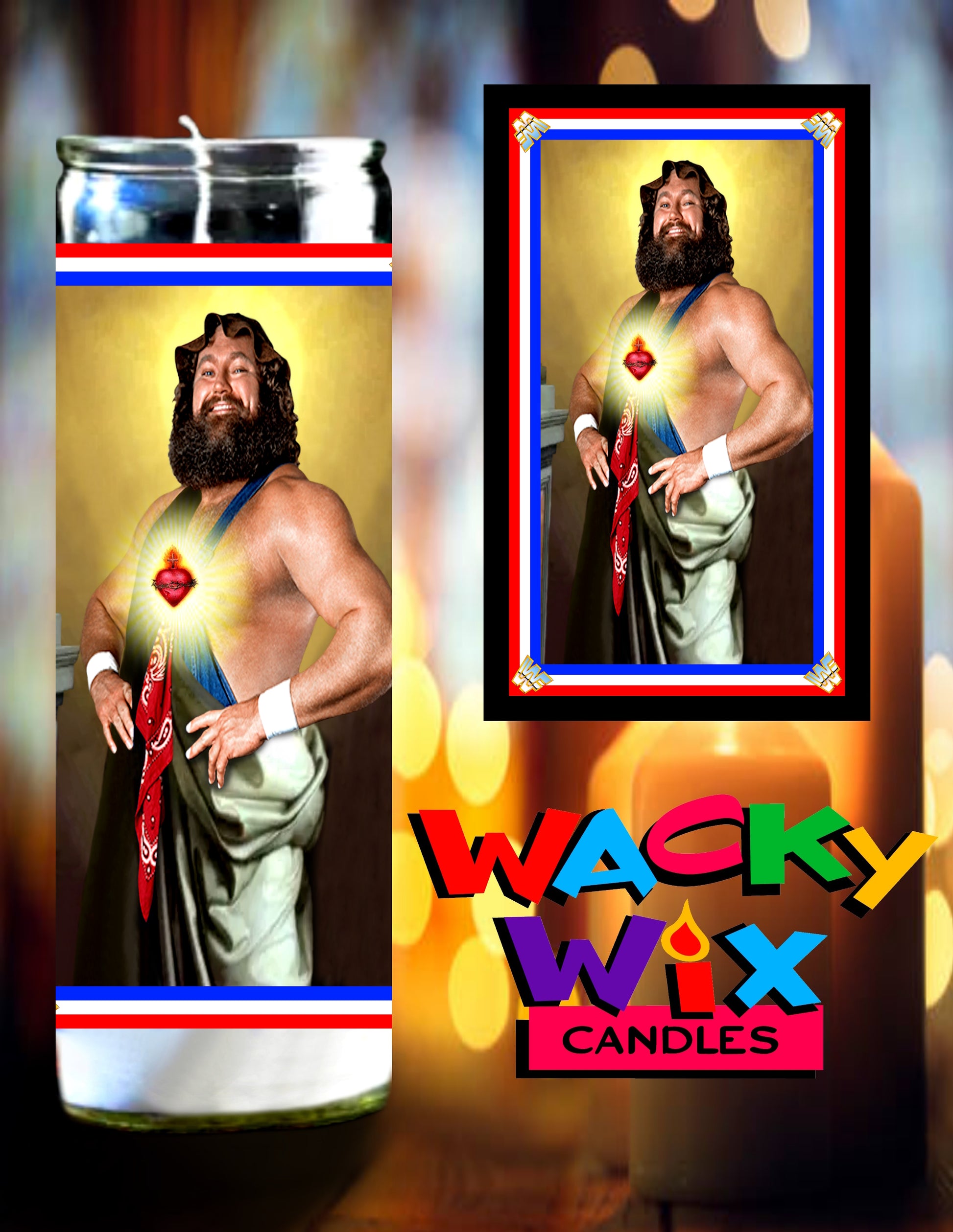This prayer candle features Hillbilly Jim famously known from the WWF. The unscented wax is enclosed in a 8 inch tall glass jar and designed to burn continuously up to 50 hours. The Hillbilly Jim sticker is made of a removable matte finished vinyl. If you decide to burn the candle, the sticker can be easily peeled off and reapplied to another clean surface. Please wait for glass jar to cool before removing sticker.