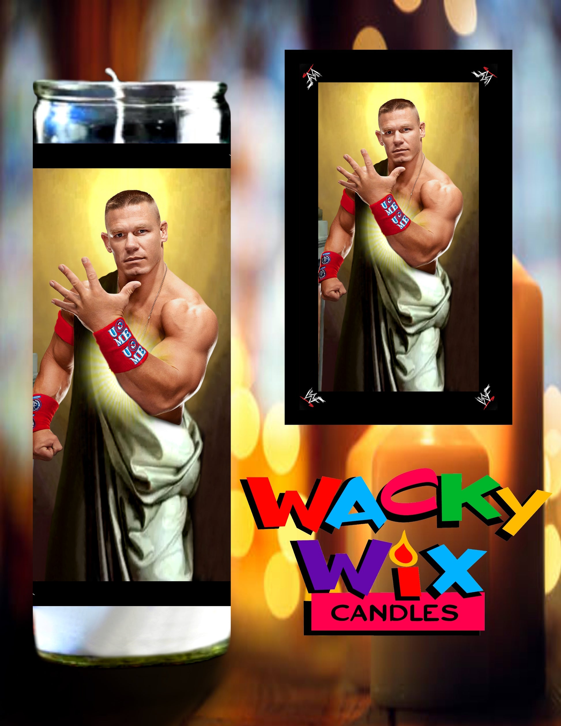 This prayer candle features John Cena famously known from the WWF. The unscented wax is enclosed in a 8 inch tall glass jar and designed to burn continuously up to 50 hours. The John Cena sticker is made of a removable matte finished vinyl. If you decide to burn the candle, the sticker can be easily peeled off and reapplied to another clean surface. Please wait for glass jar to cool before removing sticker.
