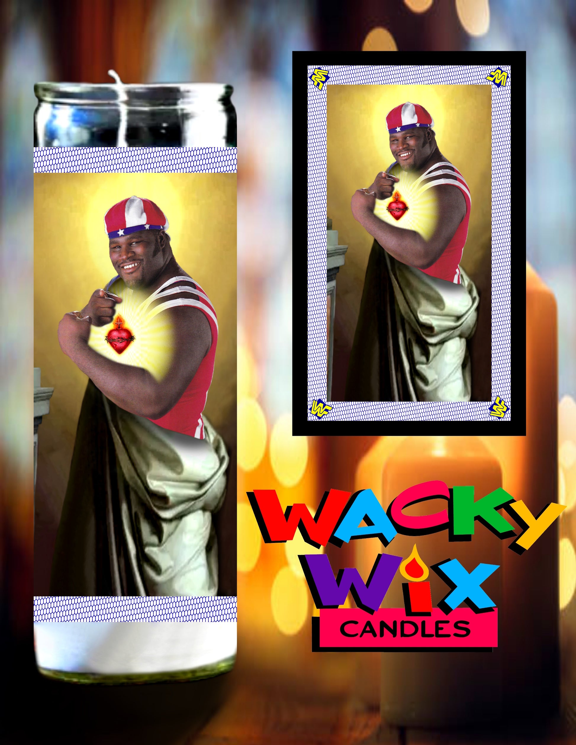 This prayer candle features Mark Henry famously known from the WWF. The unscented wax is enclosed in a 8 inch tall glass jar and designed to burn continuously up to 50 hours. The Mark Henry sticker is made of a removable matte finished vinyl. If you decide to burn the candle, the sticker can be easily peeled off and reapplied to another clean surface. Please wait for glass jar to cool before removing sticker.