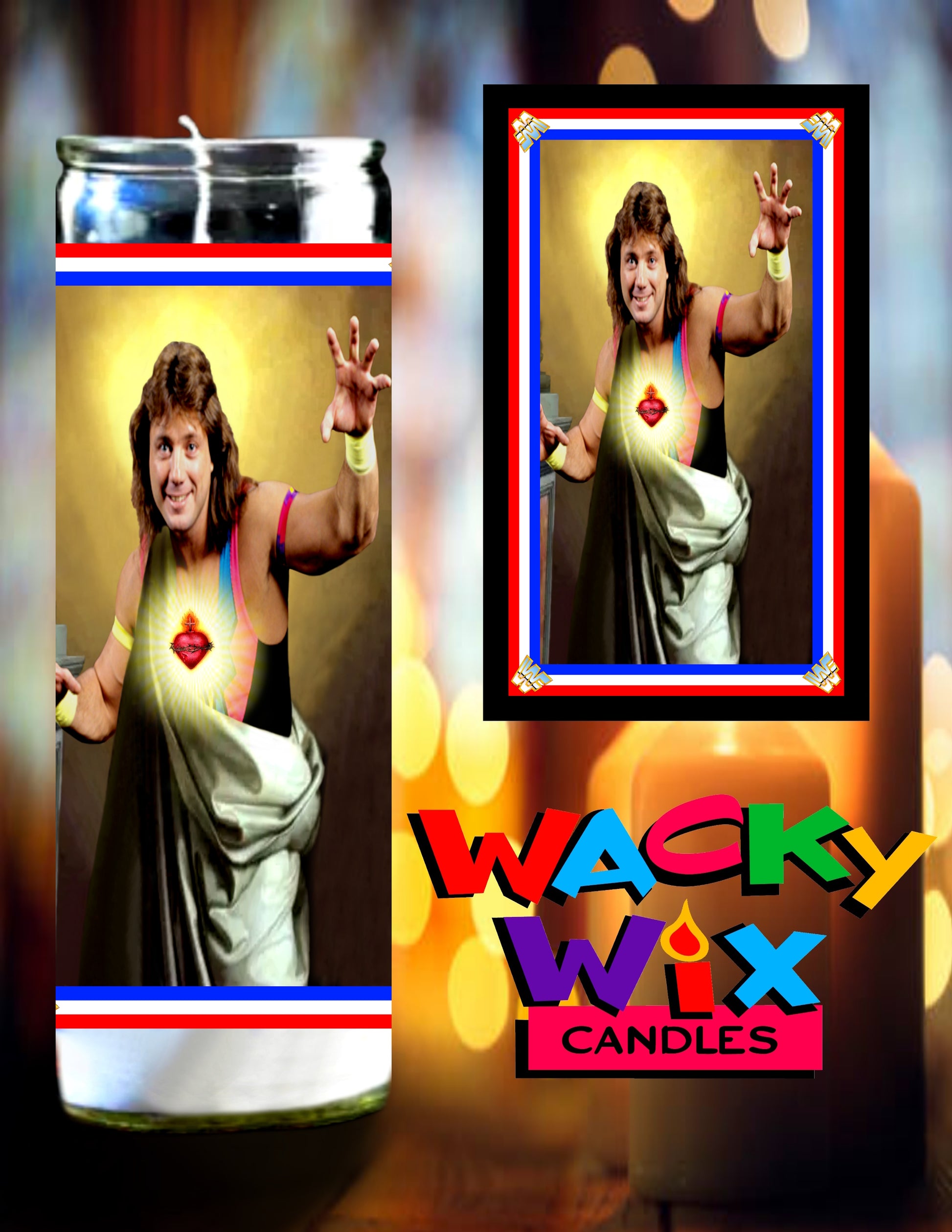This prayer candle features Marty Jannetty famously known from the WWF. The unscented wax is enclosed in a 8 inch tall glass jar and designed to burn continuously up to 50 hours. The Marty Jannetty sticker is made of a removable matte finished vinyl. If you decide to burn the candle, the sticker can be easily peeled off and reapplied to another clean surface. Please wait for glass jar to cool before removing sticker.