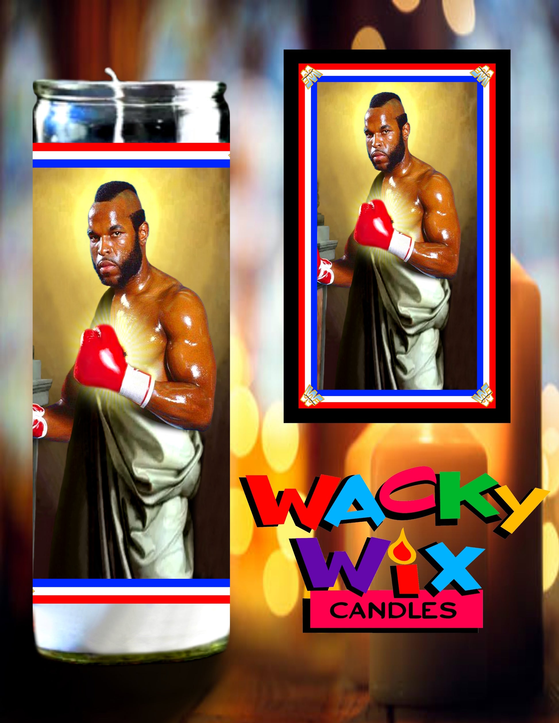 This prayer candle features Mr. T famously known from the WWF. The unscented wax is enclosed in a 8 inch tall glass jar and designed to burn continuously up to 50 hours. The Mr. T sticker is made of a removable matte finished vinyl. If you decide to burn the candle, the sticker can be easily peeled off and reapplied to another clean surface. Please wait for glass jar to cool before removing sticker.