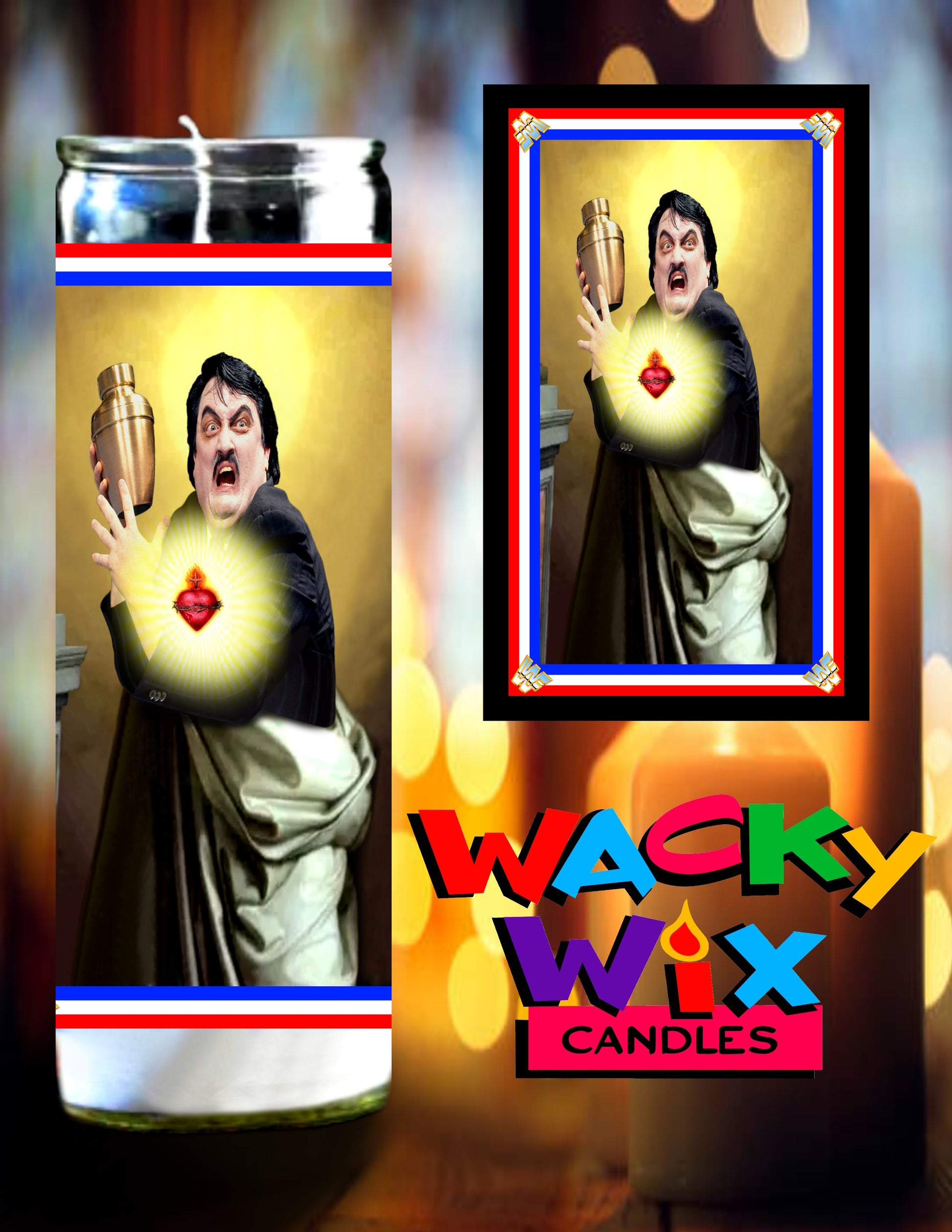 This prayer candle features Paul Bearer famously known from the WWF. The unscented wax is enclosed in a 8 inch tall glass jar and designed to burn continuously up to 50 hours. The Paul Bearer sticker is made of a removable matte finished vinyl. If you decide to burn the candle, the sticker can be easily peeled off and reapplied to another clean surface. Please wait for glass jar to cool before removing sticker.